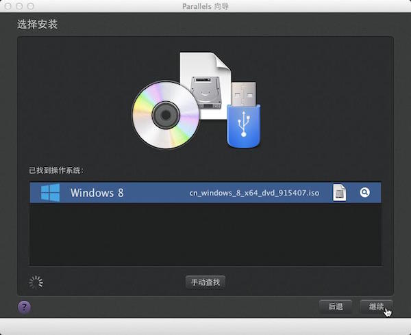 2、Parallels会自动扫描本地存储的系统安装文件,在已找到的操作系统中选择安装即可。若未找到可通过手动查找”按钮自定义查找,点击“继续”进入下一步:如图。Parallels Desktop将自动显示已找到的操作系统,选择一个进入安装,这里选择“安装Windows 8 64位”。点击“继续”进入下一步。