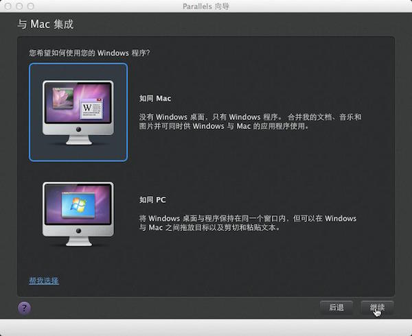 4、相比较Windows下的各类虚拟机,Parallels Desktop提供了前所未有的用户体验,安装时我们可以选择两种虚拟机的运行方式:一种是融合到OS(如同Mac),一种则是独立的Windows界面(如同PC)。当然,安装结束后在使用过程中,我们也可以随时切换。这里我们先选择“如同Mac”选项进行Windows界面安装,下图1。