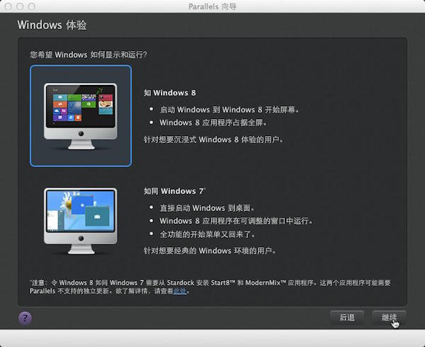 5、由于Windows 8与以往Windows系统用户界面的差异,这里Parallels Desktop 9会人性化地询问你“希望Windows如何显示和运行?”,Parallels Desktop 9提供“Windows 8”和“如同Windows7”两种运行方式!为了体验Windows 8的Metro界面,这里选择第一种界面,也就是将Windows融合到OS中进行安装,点击“继续”进入下一步,上图2。