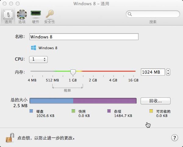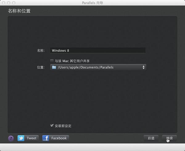 6、接着Parallels Desktop 9会提示我们设置虚拟机系统的名称和安装位置(一般情况下选择默认方式即可),可选择是否与该Mac上的其他用户共享。接着点击“继续”进行下一步操作。若勾选了“安装前设定”选项,我们可以根据自己电脑的硬件状况,进行参数调整,更好的体验Windows 8系统。当然,Parallels Desktop也可自动根据mac的硬件配置情况来默认推荐较为合理的硬件设定值。