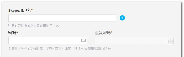 3.输入skype用户名。方便好友在skype上通过该用户名与您取得联系。输入skype登录密码。密码区分大小写,必须是要在6-20个字符之间,其中至少要包含一个字母和一个数字。(温馨提示:skype用户名一旦创建不能更改,因此一定要用自己满意的用户名。如果您输入的用户名已被人占用,请在显示建议中选择一项,或尝试其他名称。)(如下图)