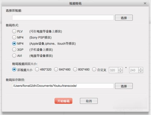 视频文件下好后,选择手动转码的界面。最上面就是原文件的路径,接着是格式,下面是视窗尺寸,最后是转码后你打算存的位置。