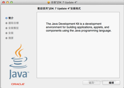 2、双击“JDK 7 Update 04.pkg”安装图标后就会弹出正式的安装界面了,开始显示的是软件的简介。点击“继续”按钮: