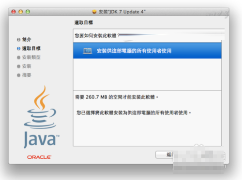 3、下面依然是.pkg文件安装的一般步骤--“选取目标”,点击里面的显示的一项后,下面的“继续”按钮会变成可点击状态,再点击之即可: