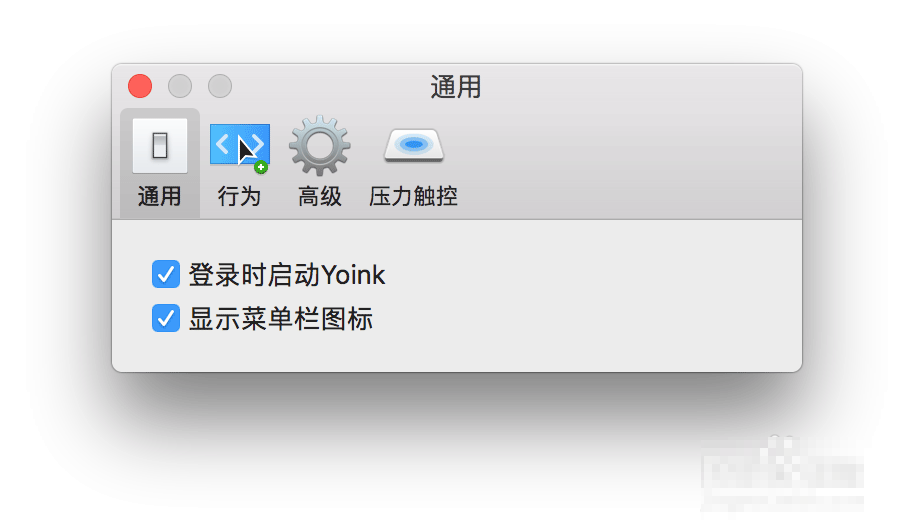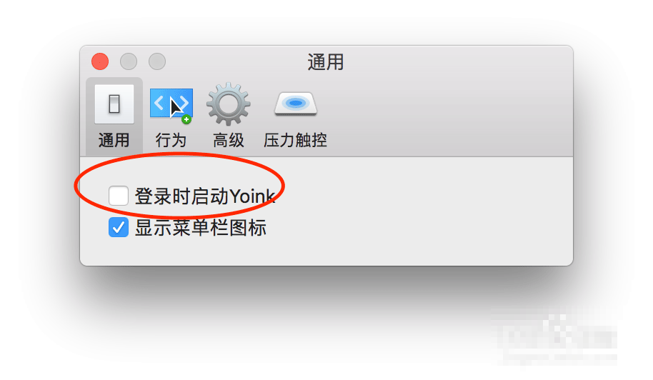 2、为了避免每次开机后才可以启动这个功能,我们设置一下开机后自动启动这个软件。点击顶上的菜单栏YoinK图标,点击偏好设置。通用这里选择启动这里打钩。