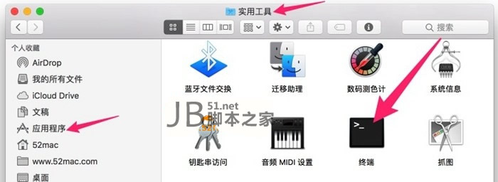 打开“终端”。终端在 应用程序 文件夹下面的 实用工具 文件夹中,图标是黑色的,如下图。