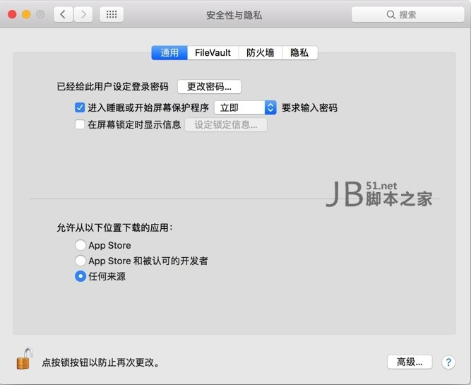 现在我们 重新打开 系统偏好设置 -> 安全性与隐私,你会发现,已经有“任何来源”这个选项了,如下图(还是没有的话,就重启下电脑试试)。