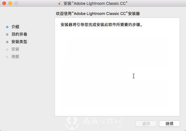 Adobe Lightroom Classic CC安装器将引导你完成此软件所需步骤,请点击继续,如图