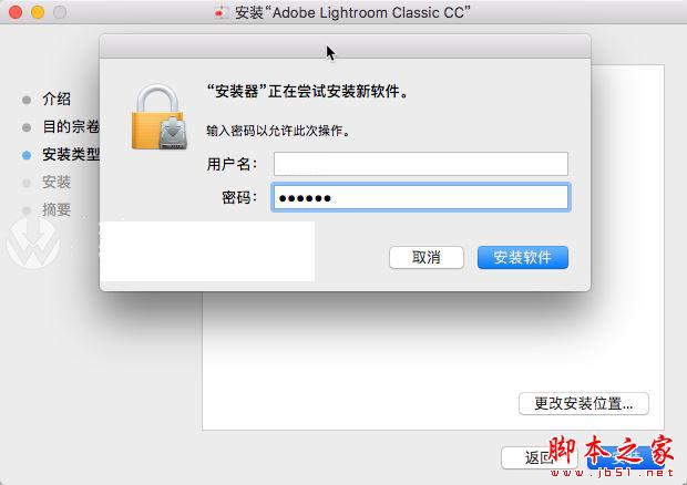 请输入电脑密码以同意Adobe Lightroom Classic CC for Mac继续安装,如图