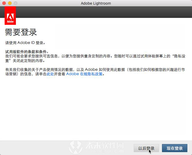首先必须先启动一次Adobe Lightroom Classic CC Mac版软件,点击以登录,如图