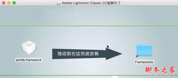 拖动Adobe Lightroom Classic CC破解补丁【amtlib.framework】到右边【Frameworks】文件夹中替换原文件,如图,点击替换即可