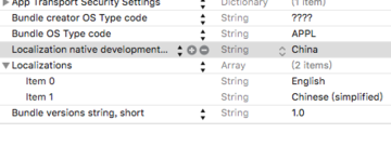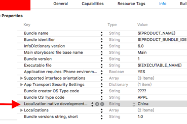 打开info, 找到“Localization native development region”,如下图。