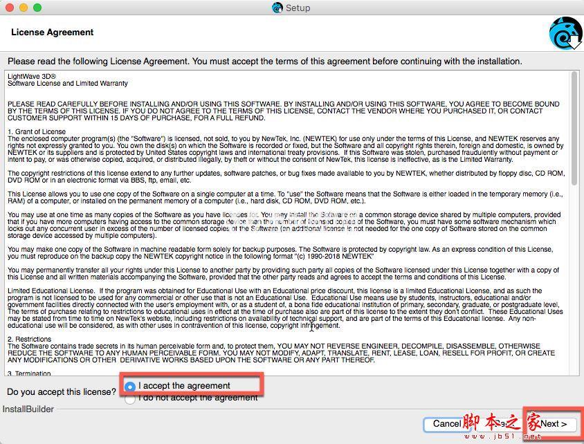 3、勾选lightwave 3d允许用户协议。然后点击【Next】。