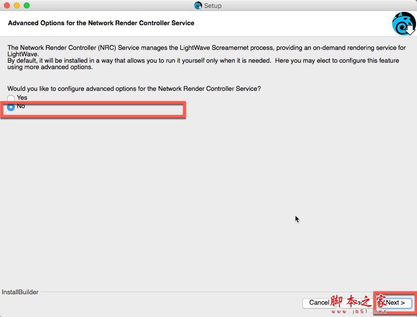 7、是否选择配置网络渲染控制器服务的高级选项吗?点击【No】。