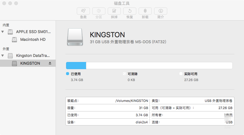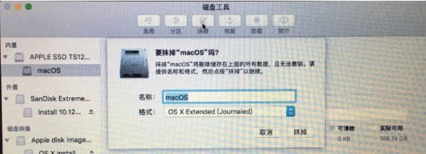 4、这时不要点击安装,因为会提示安装失败,我们打开磁盘工具,选择你插入的u盘,选择抹掉,重命名为Untitled