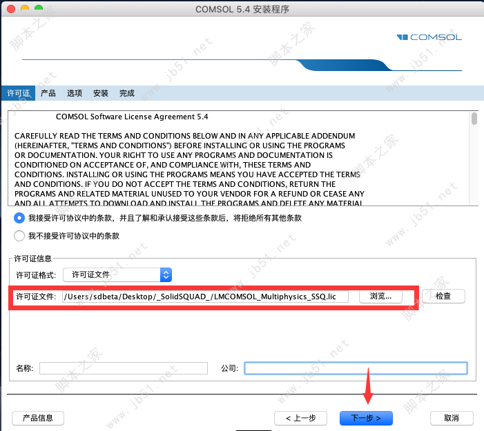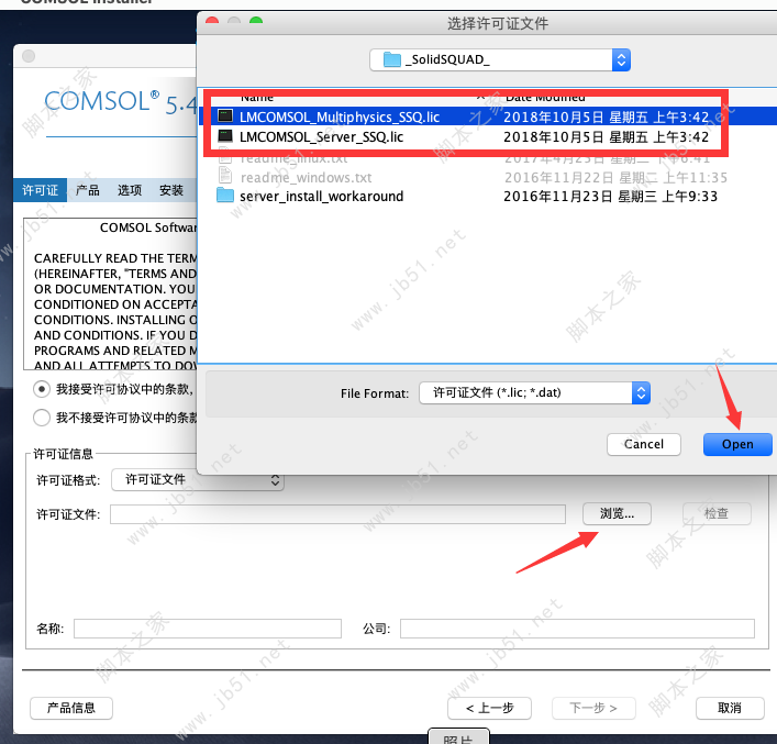 4、然后点浏览,选择压缩包内_SolidSQUAD_文件夹内的授权文件LMCOMSOL_Multiphysics_SSQ.lic,然后点open