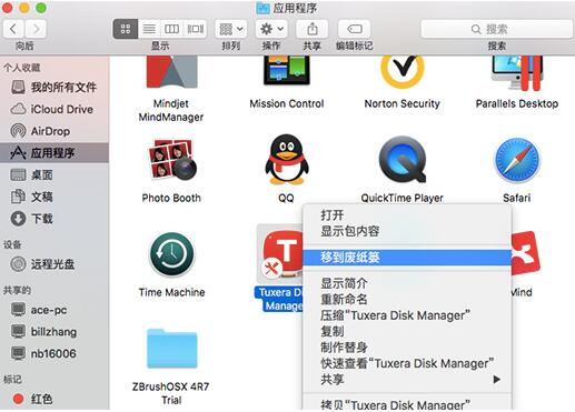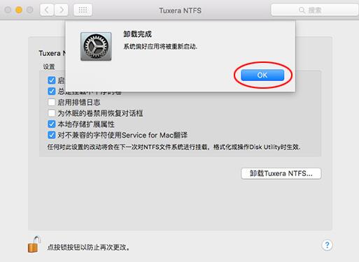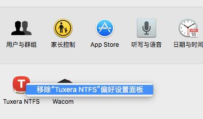 1、在偏好设置中双击“Tuxera NTFS”程序图标,只能将它移除偏好设置面板,不能将它完全移至废纸篓进行卸载,