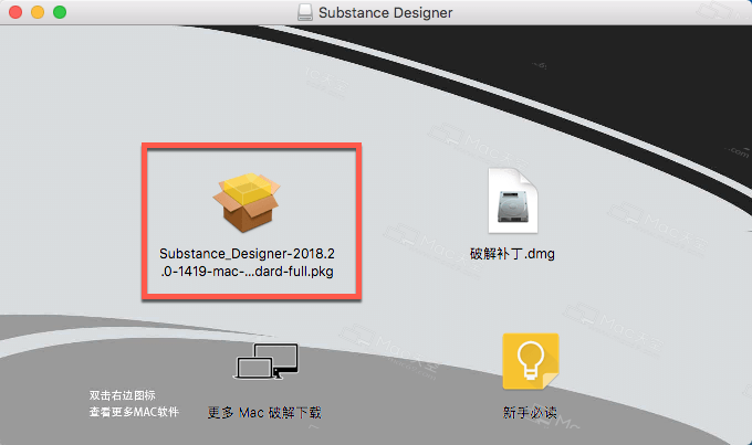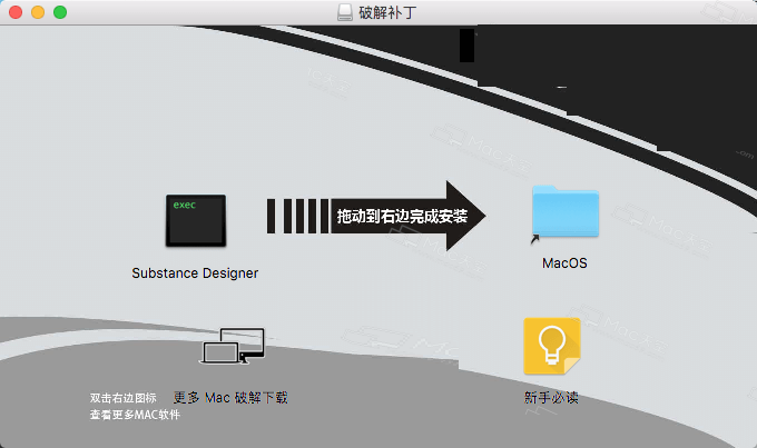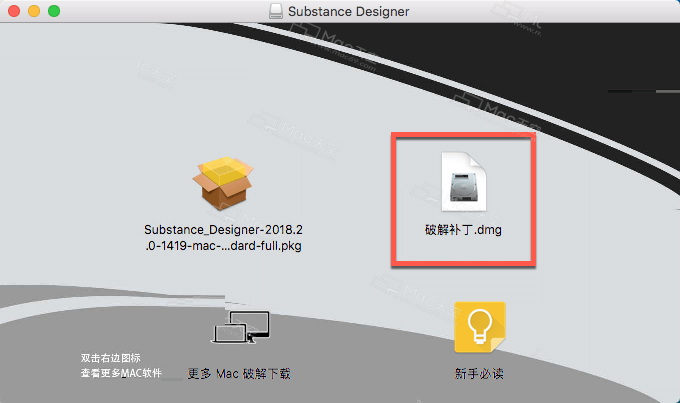 回到“Substance Designer 2018 Mac版”安装包,双击打开右侧【破解补丁.dmg】,如图: