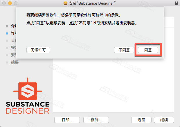 点击【同意】,同意安装Substance Designer mac 破解版,如图: