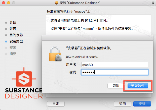 输入Mac密码后点击【安装软件】,安装Substance designer mac,如图: