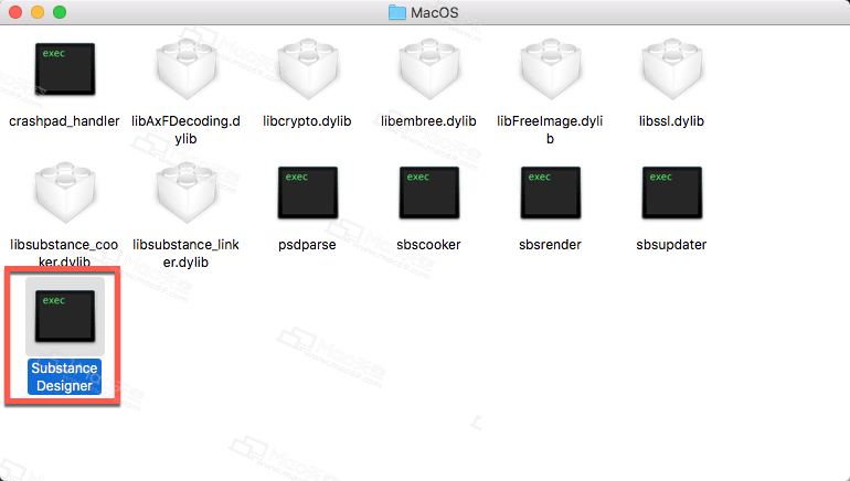 双击打开【MacOS】文件夹,双击打开之前所替换的【Substance Designer】,如图: