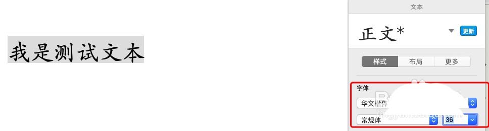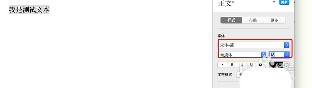 3、输入第一段测试文本,并设定样式,例如宋体,18号。