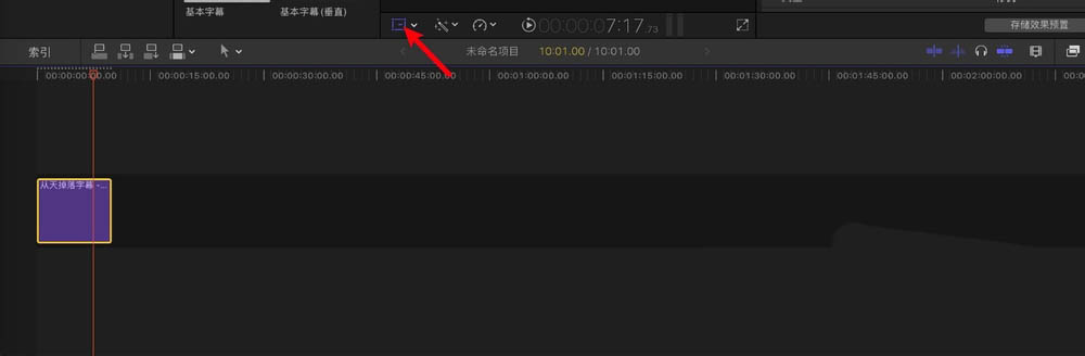 6、此时把线移到紫色字幕最后三四帧位置,把字幕从顶部拖下到预览窗底部,不要超过窗口。