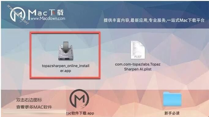打开“Topaz Sharpen AI Mac破解版”镜像包,双击【Topazsharpen_online_installer】,如图: