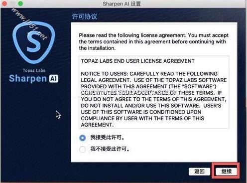 选择【我接受此许可】,点击【继续】,继续安装Topaz Sharpen AI mac,如图: