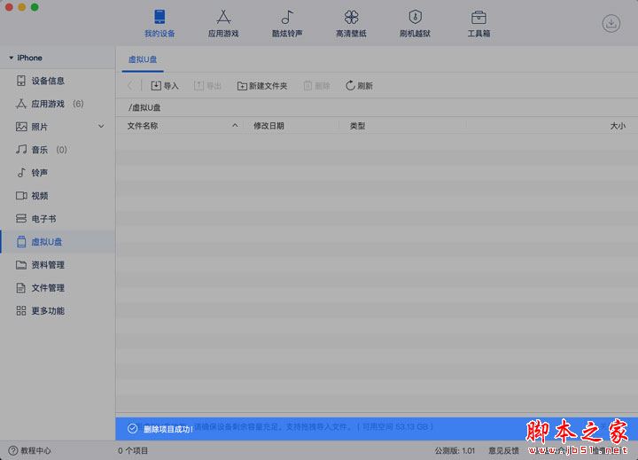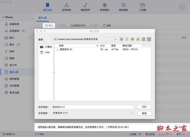 ● 将手机与电脑连接,打开「爱思助手」Mac 版,点选「我的设备」-「虚拟 U 盘」,即可进入「虚拟 U 盘」管理页面。