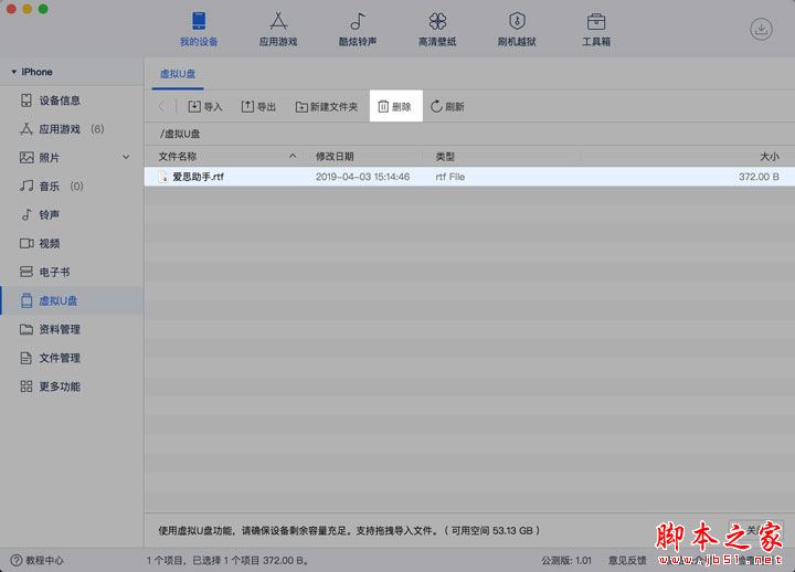 ● 文件传输完成后,如需删除文件可在连接手机与电脑后,打开「爱思助手」Mac 版,前往「虚拟 U 盘」管理页面,选择文件后,点按「删除」。