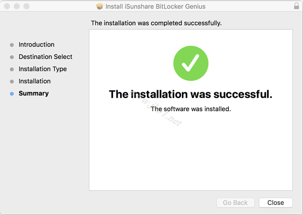 3.等待几秒钟,它将完成安装iSunshare BitLocker Genius到您的mac。单击Close退出安装窗口。