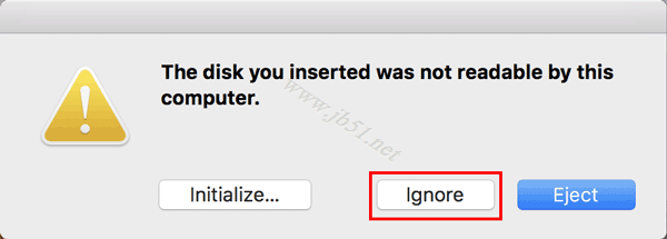 Note: 将BitLocker加密驱动器插入Mac计算机后可能会遇到"The disk you inserted was not readable by this computer" 的提示,只需单击Ignore按钮继续。.