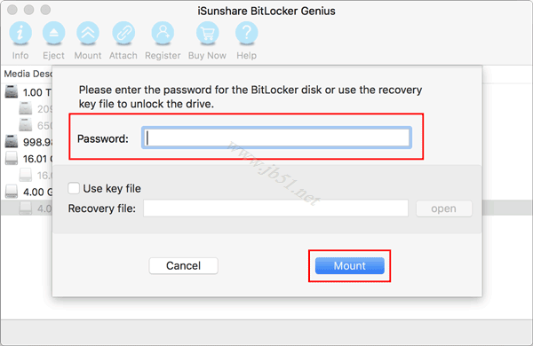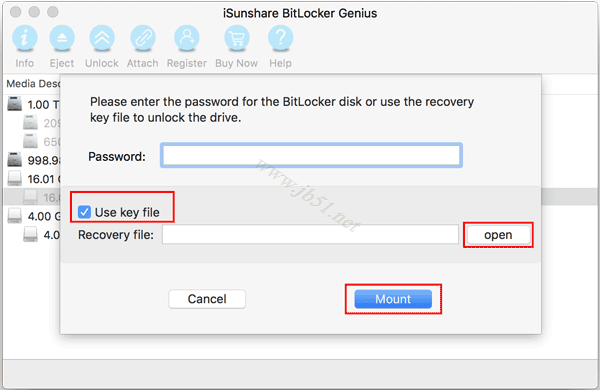 您可以选中“使用密钥文件”框,然后单击“打开”按钮添加恢复文件。然后,单击Mount轻松解锁驱动器。