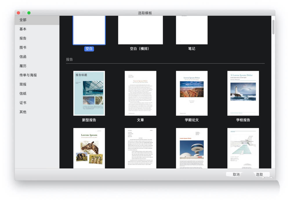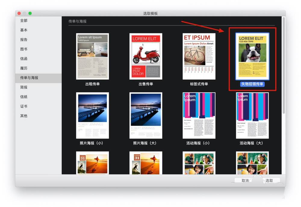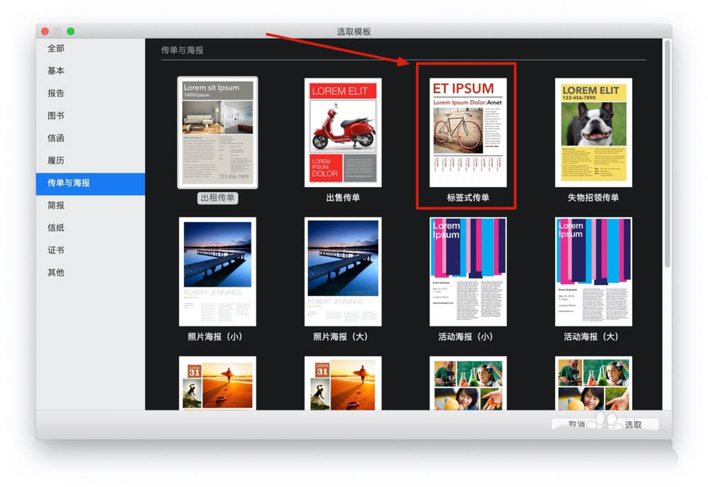 3、这时再选择Pages文稿左侧的『传单与海报』选项,如图