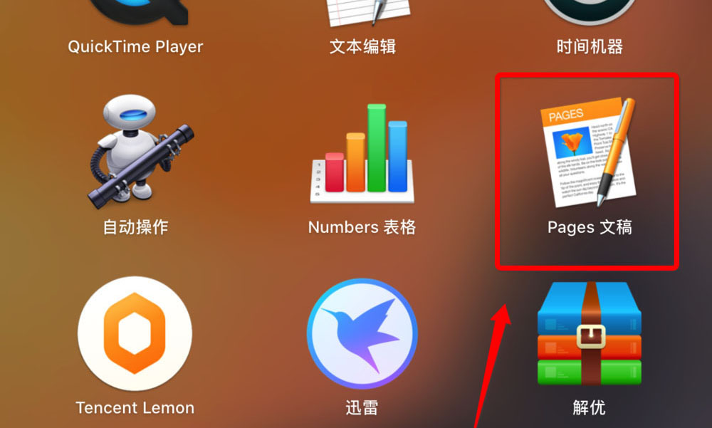 1、首先打开电脑的"启动台",然后打开Pages文稿,图