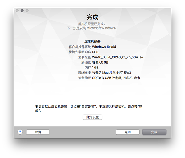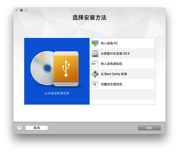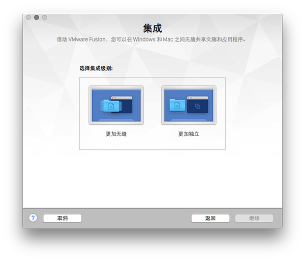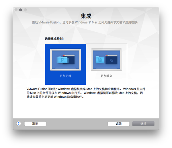 5、选择集成级别,决定是否与虚拟机系统共享Mac下的文件与应用程序,推荐选择更加无缝:
