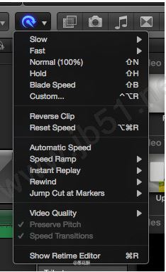 之前也提到了,final cut的片段加速/降速是在retime里面选。可以走custom,然后用百分比来制定,比如说你要某段以85%的速度播放;也可以精确到具体播放时间,比如说一个本来8.4秒的片段你要他4.7秒放完。这都是可以做到的。更酷炫的speed ram,就是同一片段,你想要先快,再慢,再快起来这样变速,同样是可以的。请选择retime里面的speed ram,选up to 0%或者from 0%都可以,然后具体再逐帧调整速度。嗯其实呢,timeline里面还可以开个precise editor,可惜我并不会用那个,也并还没有发现有什么卵用,所以我们就无视之,跳过吧……(。)