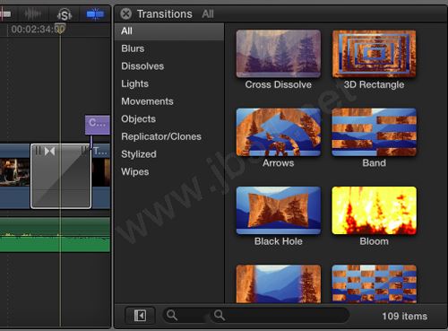 如果并不想叠画面,只是要在两个片段转换时搞个淡入淡入?那也ok,在两个片段之间放入transitions就可以了。final cut提供109种的转场,闪光啊,动态啊,逐渐变黑再亮起来等等等等,总之应有尽有,其中一些酷炫得很,还带了自定义的效果。当然,转场所需的时长也是随你定,拉动那个覆盖着两个片段之间的灰色的小条儿就行了,so easy √