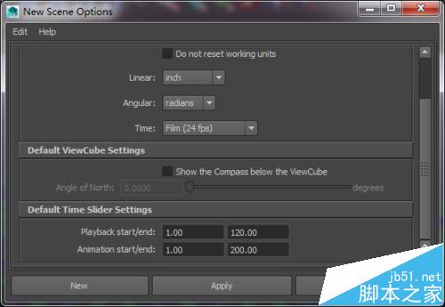 2、现在,我们可以设定一下每次启动,配置的一些参数了,比如说动画时间滑块的帧数。maya默认总长度是48帧,如果我们方便使用的是500帧数,可以通过点击菜单中的“file”->“new scene”来设定。以此还可以设置帧数播放速率的。
