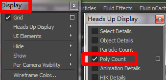 4、设置工作区的信息显示。比如打开多边形元素信息统计的显示,点击展开display-Heads Up Display,勾选上:poly count项。