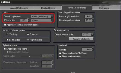 使用Vue制作自然环境,需要注意的是Vue的默认单位是米,Maya的默认单位是厘米,因此应该在创建场景前进行缩放比例的匹配。因为我在Maya中创建的模型是“模型:实物=1:10”,因此Vue软件的设置如下:File->Options->Units&Coordinates->Units->1 Vue unit is:0.1。