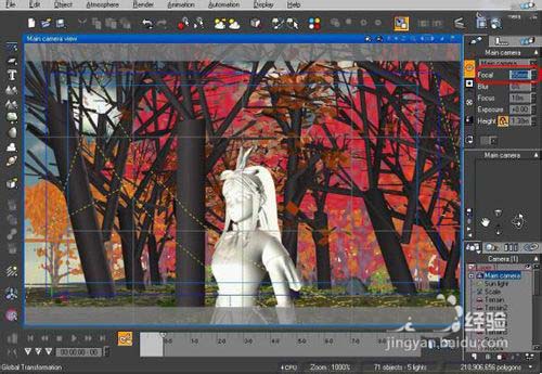 调节摄像机焦距为55mm,接近人眼的观察效果,并保存好所需的镜头。Vue中保存摄像机的方式有点像maya的摄像机标签功能,它并不会增加新的摄像机;虽然在Vue中可看到多个摄像机图标,但是在通过Vue对maya的接口导入maya场景时,只会得到Vue文件最后一次保存时所选择的摄像机。