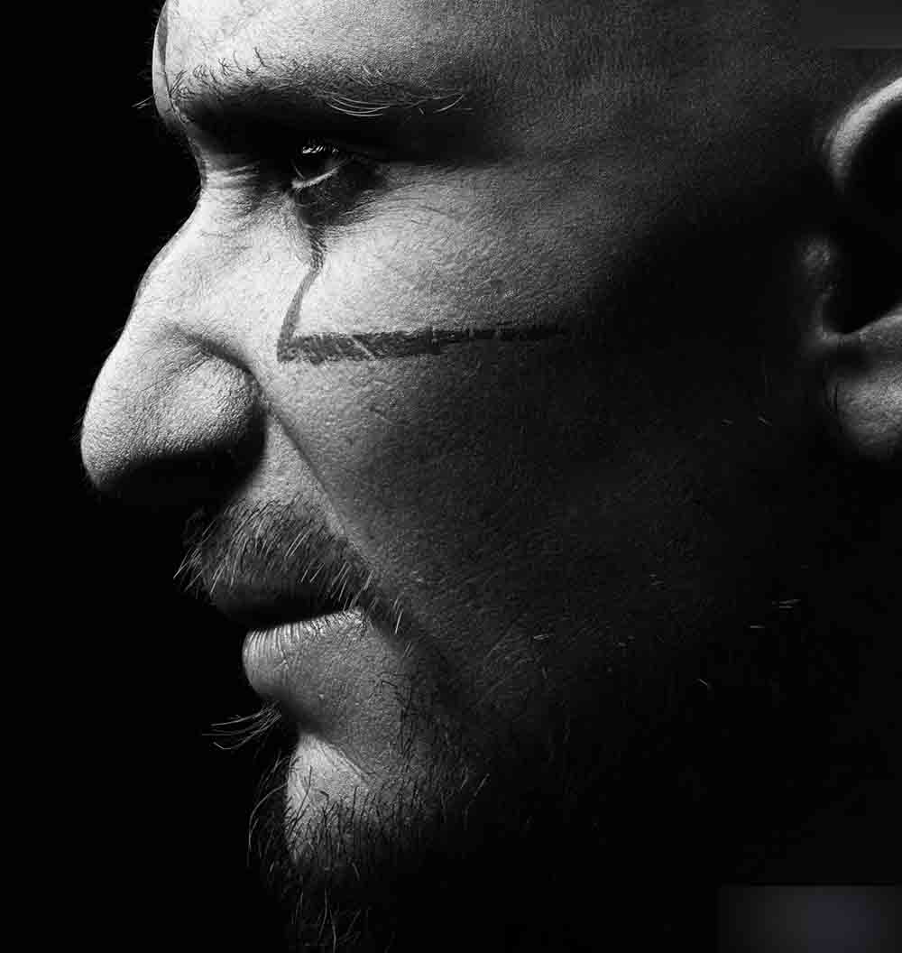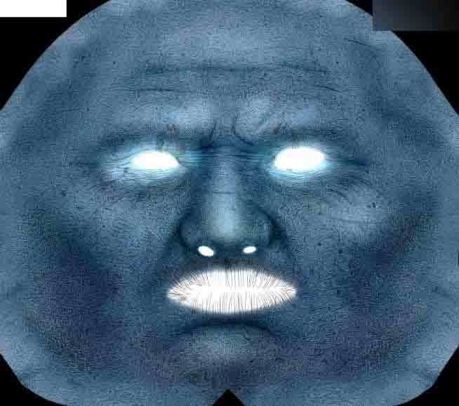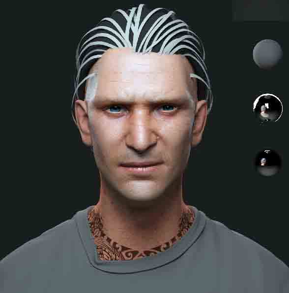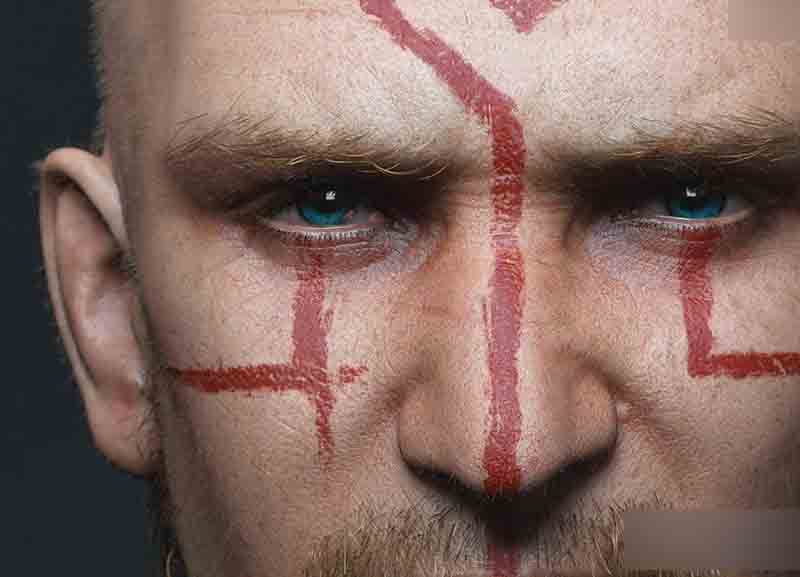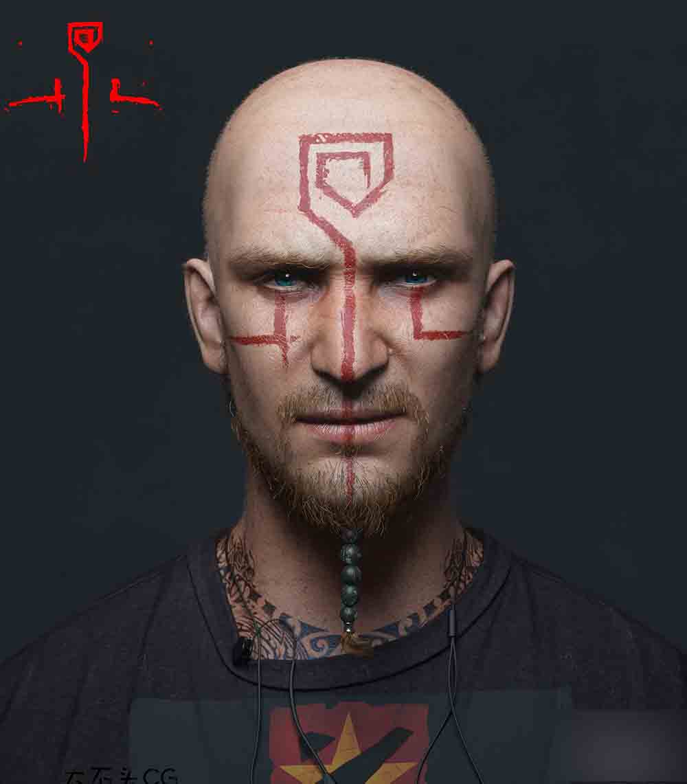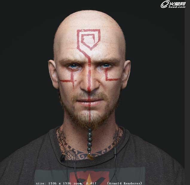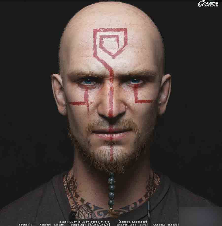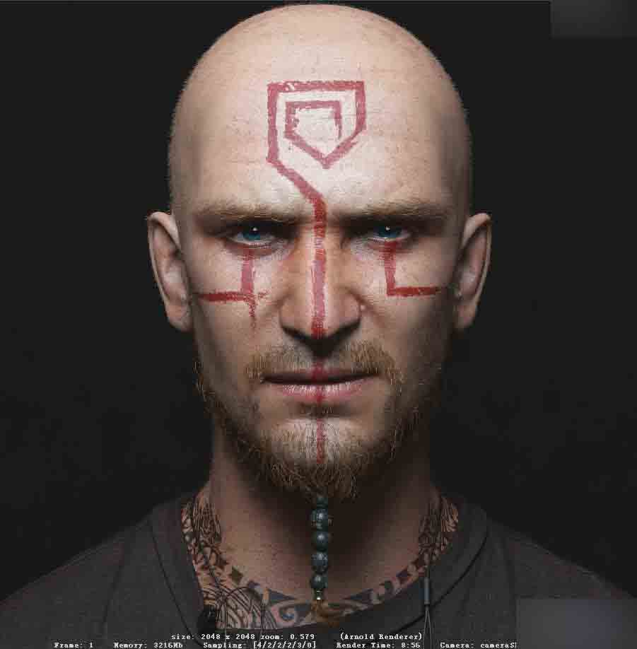 现在模型有点腻,高光也比较油,所以我加上汗毛,汗毛可以让脸部高光更真实,增加更多细节。然后画上脸谱,可以增加更多元素,也能分辨出高光的区别,让画面更丰富。