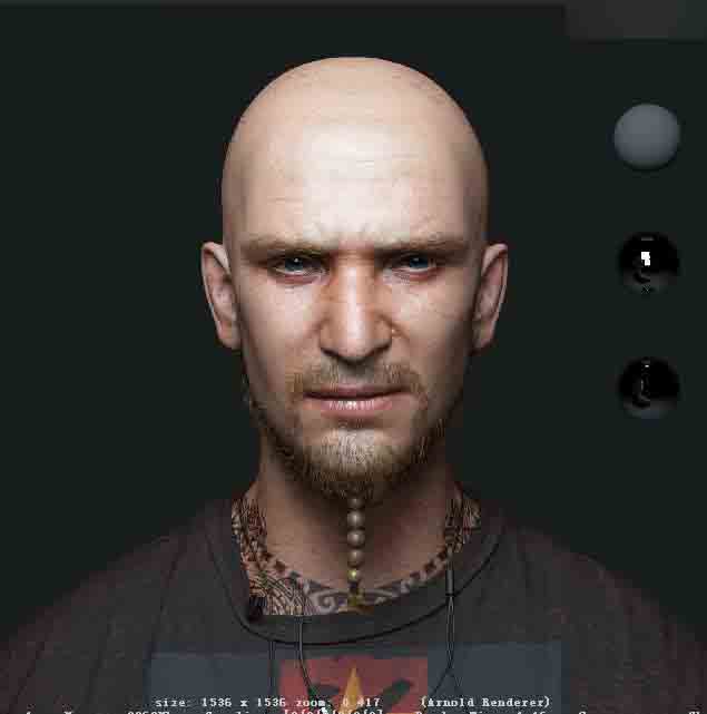 这里我决定去Maya里先渲一下,测试一下效果。我烘焙了置换和法线贴图,在Maya里使用阿诺德渲染。这里需要注意的是,我把头部分成了2张UV,这样可以获得更多的精度,2张都是4K。简单的打了个光,目前有点肿,纹理细节还原的还不错。