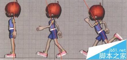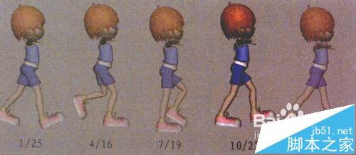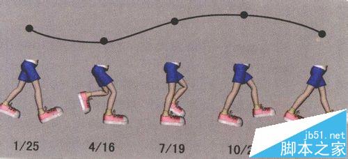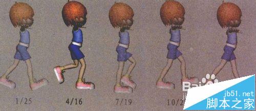 2)在第25帧时,其步伐是与第1帧一样的,人物完整的一步需要24帧。第13帧的动作是与第1帧相反的,另外一条腿在前。在第7帧时,单腿支撑着地,重心落在着地的腿上,另一条腿提起压在支撑腿上的体重,重新开始向上移动。如果改变这个姿势,我们就能使每个人的步伐极大地个性化,如下图所示。