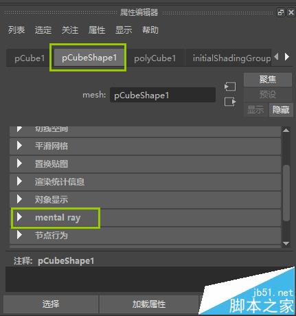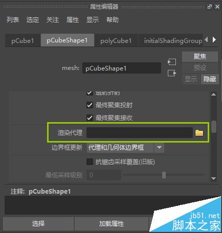 pCubeShape项目下的mental ray,展开后在渲染代理内选择刚才导出的mi文件,这时场景内的多边形会自动匹配模型大小。