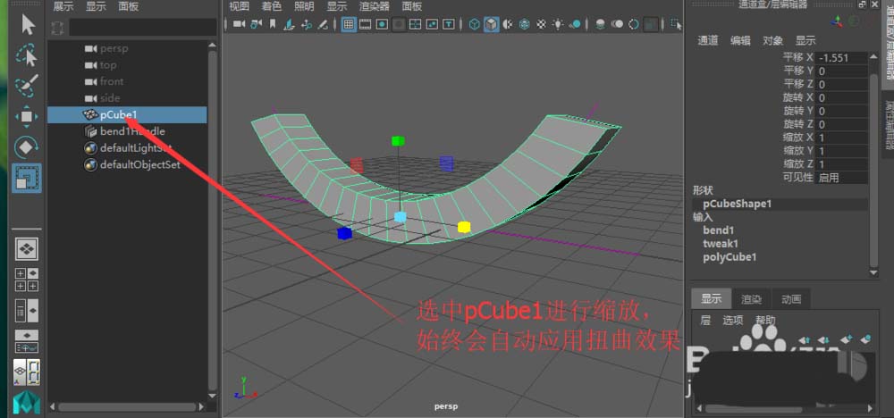 6、如果我们选中pCube1进行缩放,我们看到,弯曲效果被实时的应用了。