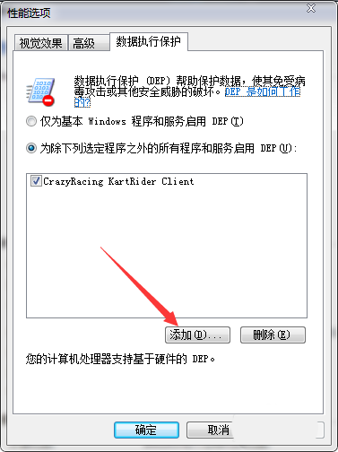 3、在弹出的 “性能选项” 窗口中,切换到【数据执行保护】 选项卡,并且选择 【为除下列选定程序之外的所有程序和服务启用】,点击【添加】