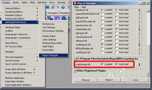 1、首先,要确保你的Maya中带有VRay,如果没有请先安装这个插件。加载插件,选择Window > Settings/Preferences > Plug-in Manager,打开插件管理器,然后找到vrayformaya,选中Loaded和Auto load